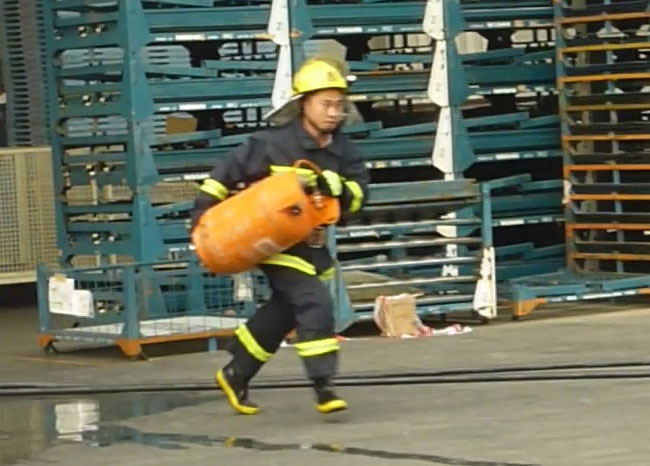 演習(xí)模擬物流科出貨區(qū)的一名叉車(chē)員工操作不當(dāng),將存放LPG的存貨架撞倒,導(dǎo)致貨架上的LPG(石油液化氣罐)其中兩瓶發(fā)生了泄漏,隨時(shí)存在燃燒和爆炸的危險(xiǎn)性.險(xiǎn)情出現(xiàn)后安全事物局立即確認(rèn)再場(chǎng),總指揮黃副總判斷需全員疏散,并召集相關(guān)成員進(jìn)行疏散任務(wù)安排.11:41分警鈴響起并利用廣播系統(tǒng)通知所有員工進(jìn)行緊急疏散.隨后消防車(chē)進(jìn)入工廠(chǎng)對(duì)險(xiǎn)情進(jìn)行撲救。