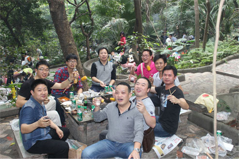 過了馬路我們來到南門口,先整理一下行裝,清點(diǎn)人數(shù),接著我們就一行30人,一人拿一袋背一包,開開心心、浩浩蕩蕩的隨人流上山去了。剛?cè)雸霾痪?,走?00米左右就見到有電瓶環(huán)保車,我們果斷包下了3架。電瓶車緩緩行駛在上山的道路上。大概過了10分鐘車程就到了,一路風(fēng)景怡人,山清水秀。陣陣涼風(fēng)吹過,使人心曠神怡。下車就是本次活動的盤踞地——大夫山景觀燒烤場。我們再次集合清點(diǎn)人數(shù),一個接著一個到達(dá)半山腰。我們包的是三個爐就在整個燒烤場的最頂端。絕對有“會當(dāng)凌絕頂,一覽眾山小”的氣勢!環(huán)視四周后,粗略的感受了一下大自然的氣息后,馬上趕緊起爐、升火、燒東西。一大早出門,還來不及吃早餐,此時此刻腸子都餓青了,手腳當(dāng)然要快了!好在80零后的我們都有在農(nóng)村生活的經(jīng)驗,升火煮飯,野外求生還是懂一點(diǎn)的。很快我們的爐子內(nèi)的石碳已經(jīng)燒的通紅。架起格柵放在爐頭上,擺上食物!我們都是食肉獸,肯定是先肉后齋。牛扒、豬扒、雞扒、雞翅、玉米、蘑菇。我們分工合作,有人負(fù)責(zé)翻食物,有人上醬油,有人上蜜糖,有人控制火力!反正就是合作無間,有你有我,其樂融融!東西燒好后如我們簡直像餓鬼投胎一樣饑腸轆轆的我們,根本不顧形象開始狼吞虎咽,風(fēng)卷慘云,不講你肯定也能想得到此情此景吧!酒過三循飯亦飽,好了,各自散開吧,按照自己的喜好,三五成群打球,劃船,放風(fēng)箏,欣賞風(fēng)景,悠哉聊天,還真有人捕捉蝴蝶的……!