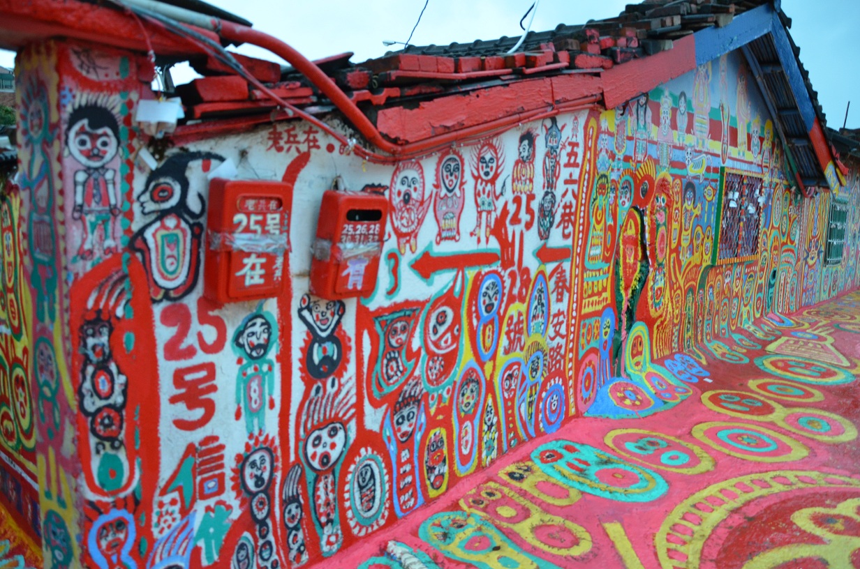 小學二年級的語文課本第一課,我的祖國真?zhèn)ゴ笊暇陀信_灣日月潭。那時候就有一份憧憬??墒?,可是,因為那可愛的臺風,我們只在門口看了一眼,和日月潭三個字合影留念。日月潭沒去成,但是去了一個很有意義的地方就是“彩虹村”你看到這紅紅的墻壁就是彩虹村,這是一位老兵爺爺在9 1歲的時候因為看到村子老舊、冷清親手畫出來的,因為他的這一畫這里不在冷清,一大批的游客翩然而至。小村恢復了活力。