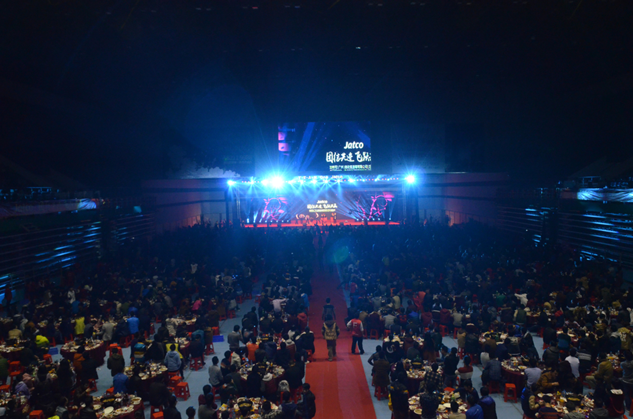 1月29日,星期五下午四點半43輛大巴車緩緩地離開公司前往位于公司7公里左右的廣州國際羽毛球中心。一年一度加特可(廣州)2000多人歡聚一堂的忘年會,如約和大家見面??赡苁沁B天氣都感受到我們的熱情,在第一批準(zhǔn)備人員出發(fā)后,廣州持續(xù)的陰雨天氣也轉(zhuǎn)晴了。