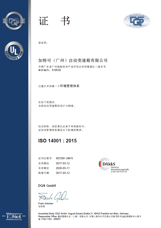 2017年1月,廣州加特可順利通過更新審查,取得了ISO14001環(huán)境管理體系(2015年版)認(rèn)證資格。ISO14001 : 2015版成為公司環(huán)境業(yè)務(wù)的CAPDo順利進行的有效工具。公司更新審查取得圓滿成果,進一步提高了公司對應(yīng)工廠周報地區(qū)環(huán)境變化的能力,今后,廣州加特可將在運行實踐中對體系要求不斷優(yōu)化升級,使各項管理工作更加科學(xué)化、規(guī)范化,不斷提高環(huán)境管理水平。
