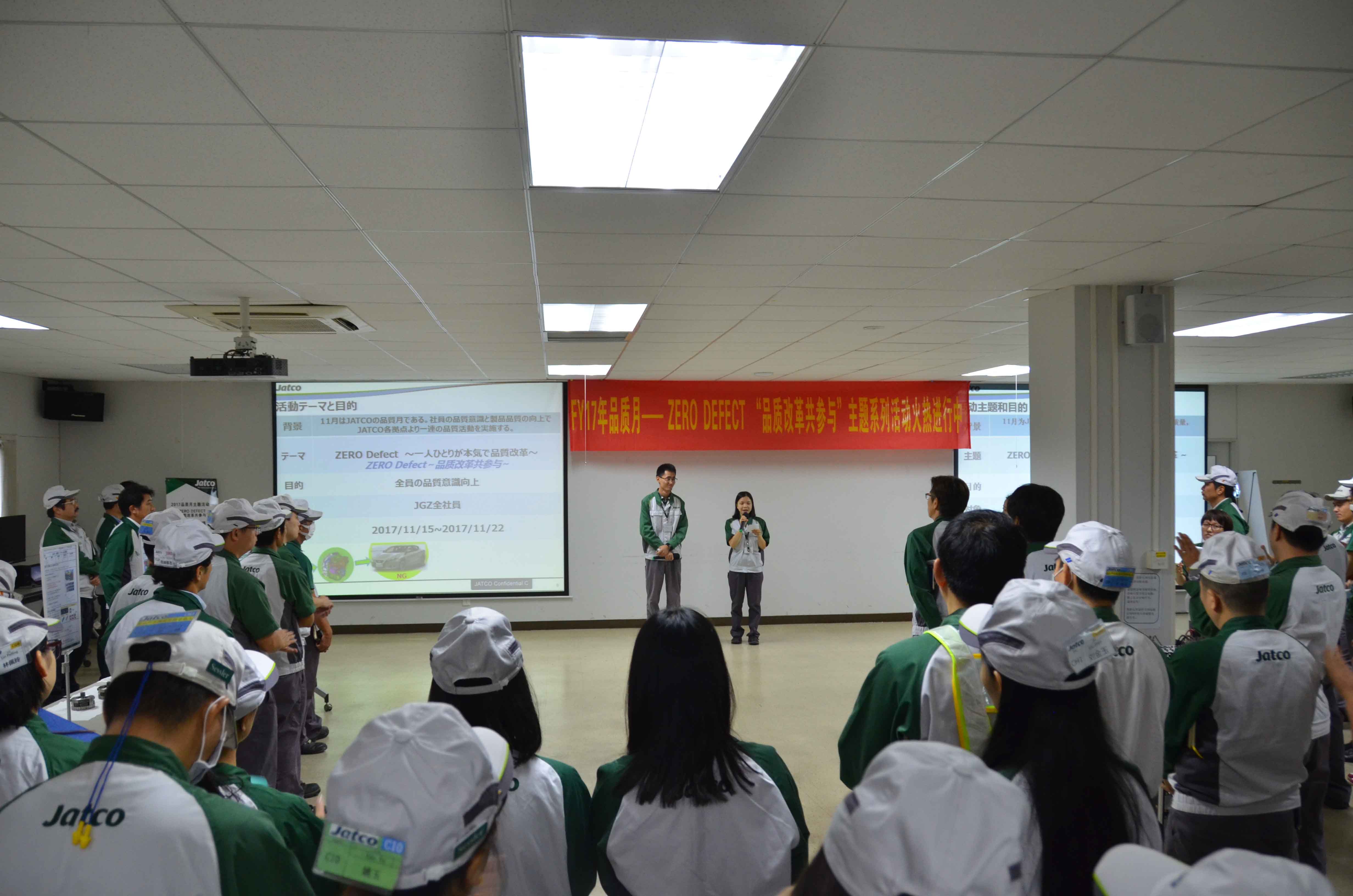 11月15日品質(zhì)月開幕式在二研C舉行,開幕式上加藤工廠長和中野副總分別對納入、市場品質(zhì)KPI達(dá)成狀況進(jìn)行了說明,FY17在超負(fù)荷生產(chǎn)的狀況下,納入和市場品質(zhì)KPI均達(dá)成了目標(biāo)。這當(dāng)中離不開每個人的努力,希望大家在今后的工作中能積極主動地去發(fā)現(xiàn)問題、解決問題。最后,秋山總經(jīng)理對本次品質(zhì)月活動的主題進(jìn)行了解讀,1臺變速箱不良在客戶眼里就是100%的故障,希望大家在工作當(dāng)中從客戶的角度出發(fā),以ZERO DEFECT為目標(biāo),思考如何改善品質(zhì),提高客戶信賴感。