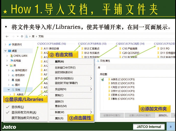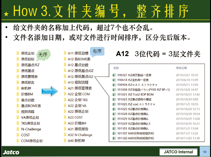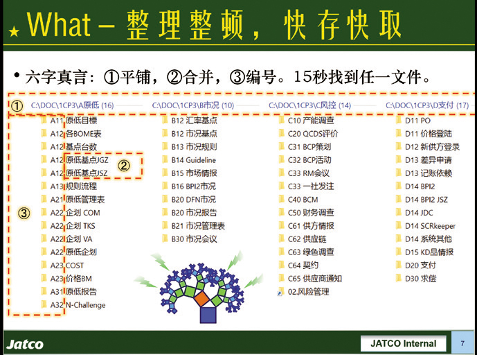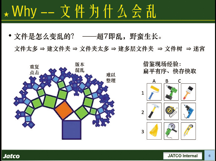 陳煉將文件整理,巧妙比喻成軍訓(xùn),課件前后還用當(dāng)兵前后的對比照,來呈現(xiàn)概念,既形象又有趣。 |