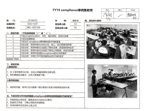 Compliance社內(nèi)事例集教育活動 加特可廣州實施了首次Compliance事例集教育workshop活動。此次活動由Compliance事務(wù)局主辦,參加對象為各部門的Compliance推進(jìn)員,共計28人。 |