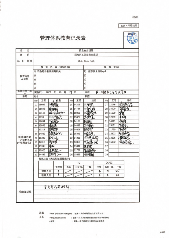 信息安全KY教育活動 作為FY20年度信息安全意識強(qiáng)化活動的一個環(huán)節(jié),7月起,加特可廣州 ISec事務(wù)局對公司內(nèi)OA PC使用者(含外包人員)實施每月一次的信息安全KY教育。公司內(nèi)對象人員的實施率為100%。 |