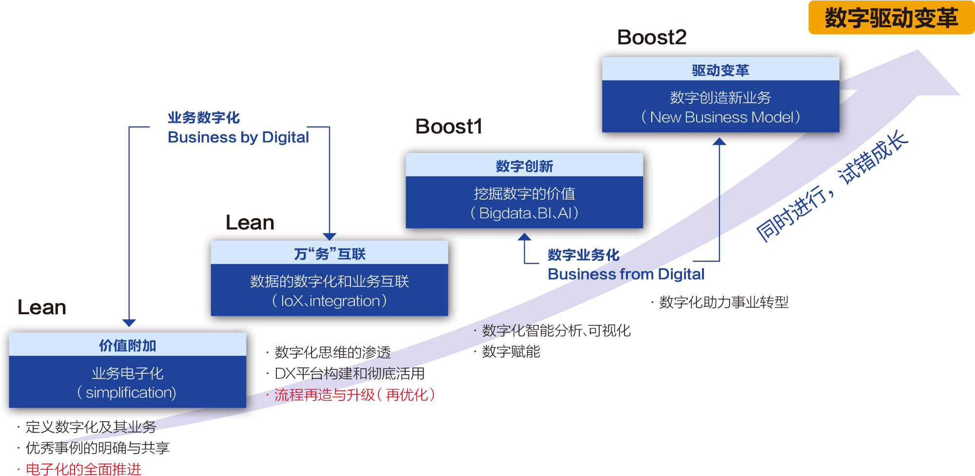 【戰(zhàn)略路線】(Lean)價值附加→(Lean)萬“務(wù)”互聯(lián)→ (Boost1)數(shù)字創(chuàng)新→(Boost2)驅(qū)動變革