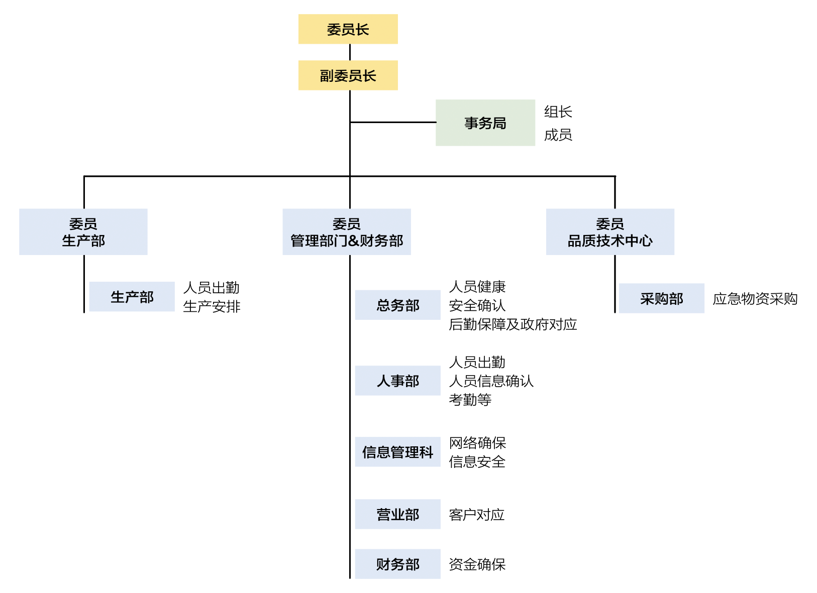 為對應(yīng)新冠肺炎疫情,加強防控工作,維護正常生產(chǎn)秩序,確保全員健康安全,根據(jù)政府相關(guān)要求及加特可廣州的需要,疫情發(fā)生后成立臨時疫情對應(yīng)委員會,架構(gòu)如圖: