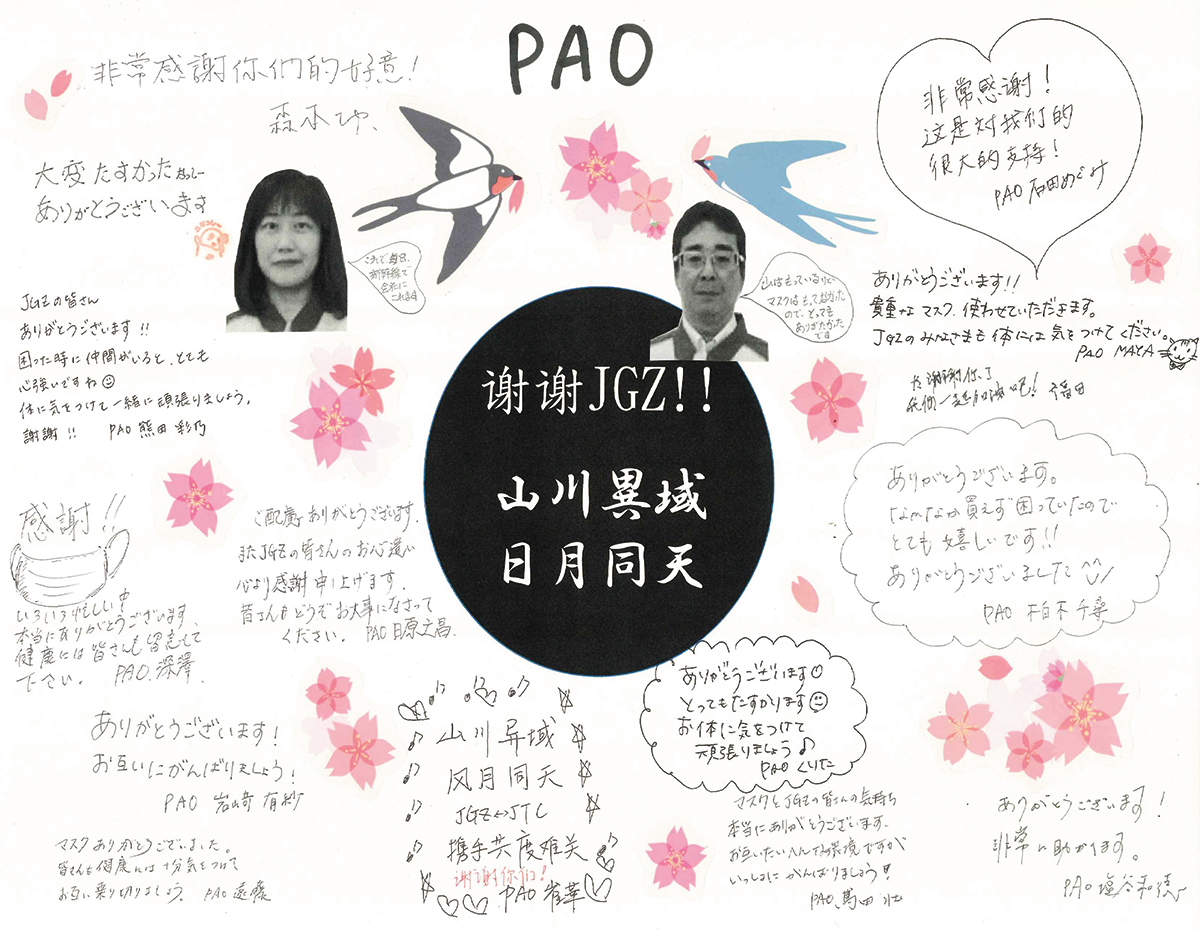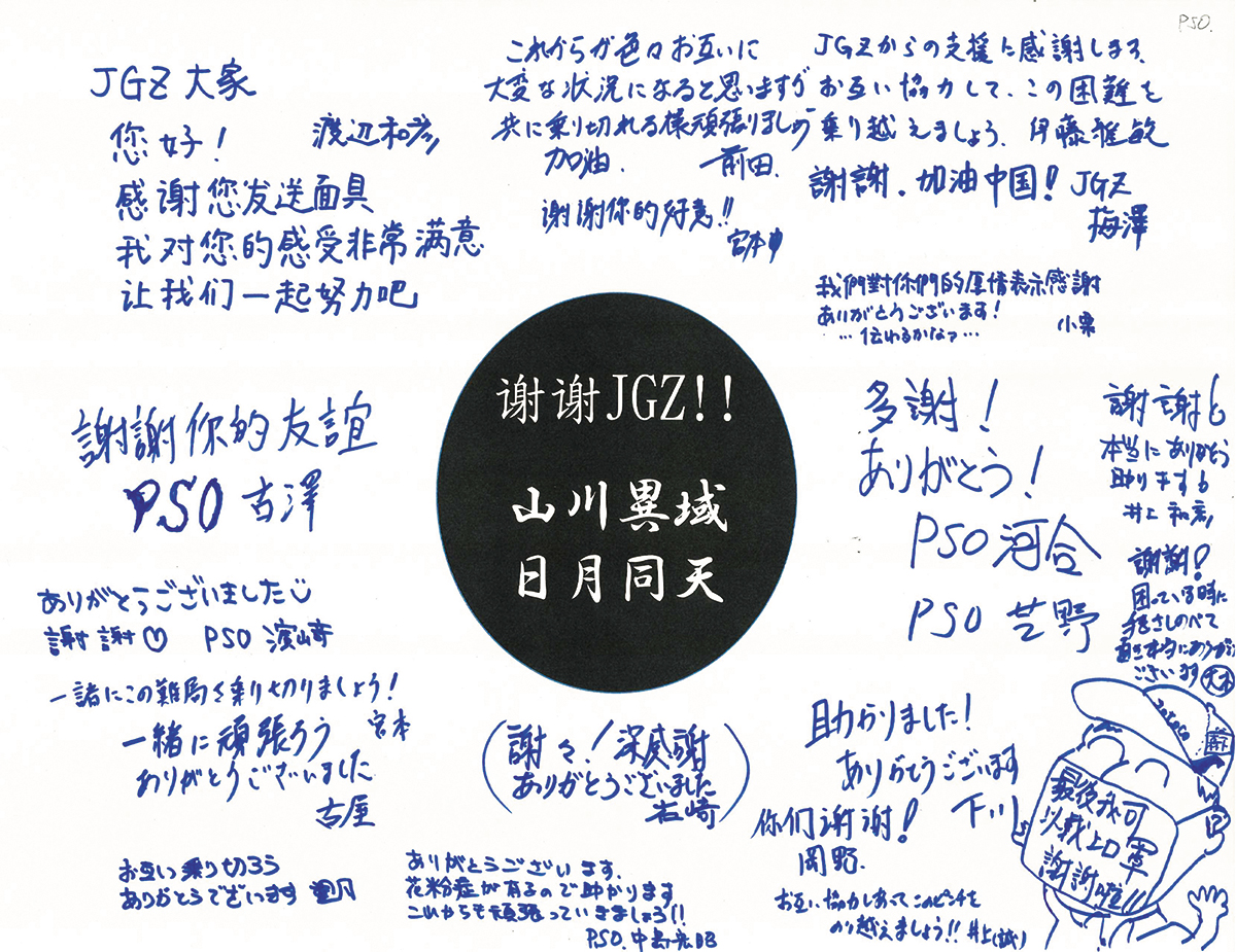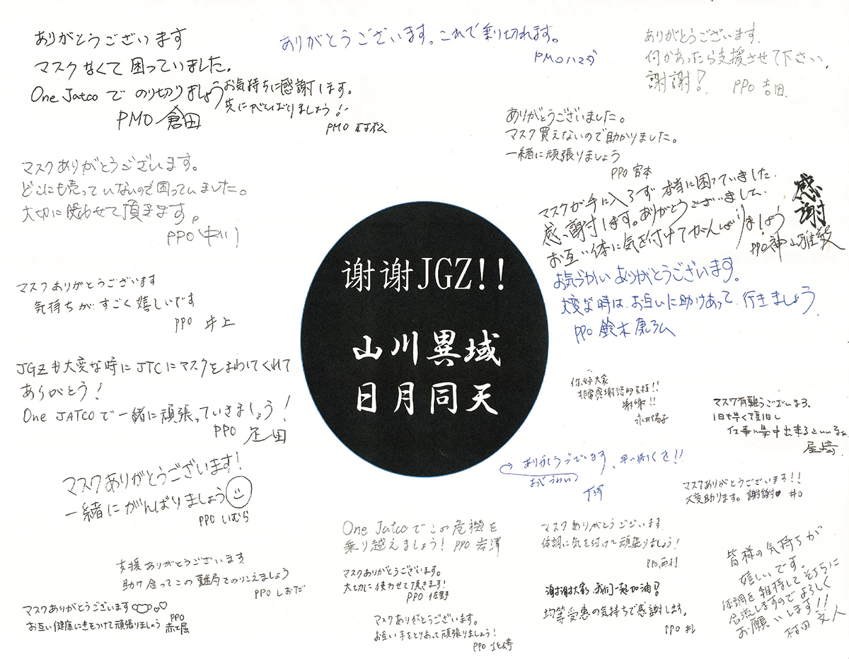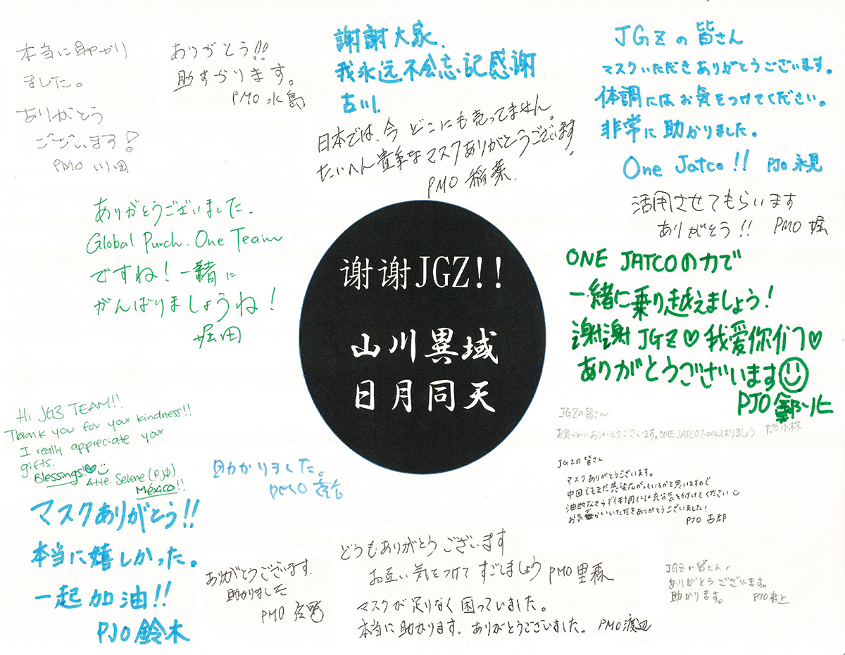 疫情最初在中國暴發(fā),加特可日本得知消息后,為加特可廣州支援了一批愛心口罩,印象最深刻的是其中帶有可愛圖案的兒童口罩,分到了家中有小孩的員工手上,解決了當(dāng)時(shí)的燃眉之急。中國疫情得到有效控制后,日本疫情變得嚴(yán)重,投我以桃,報(bào)之以李,加特可廣州同樣給日本加特可回贈了愛心口罩。雙方在互贈過程中,相互勉勵(lì)、相互感謝,交換了不少留言卡、感謝信,至今讀來,依然讓人瞬間淚目。“從疫情暴發(fā)至今已超一年,公司還在堅(jiān)持每天都為員工派發(fā)口罩,防疫物資的供給確保讓我們成就感滿滿。”