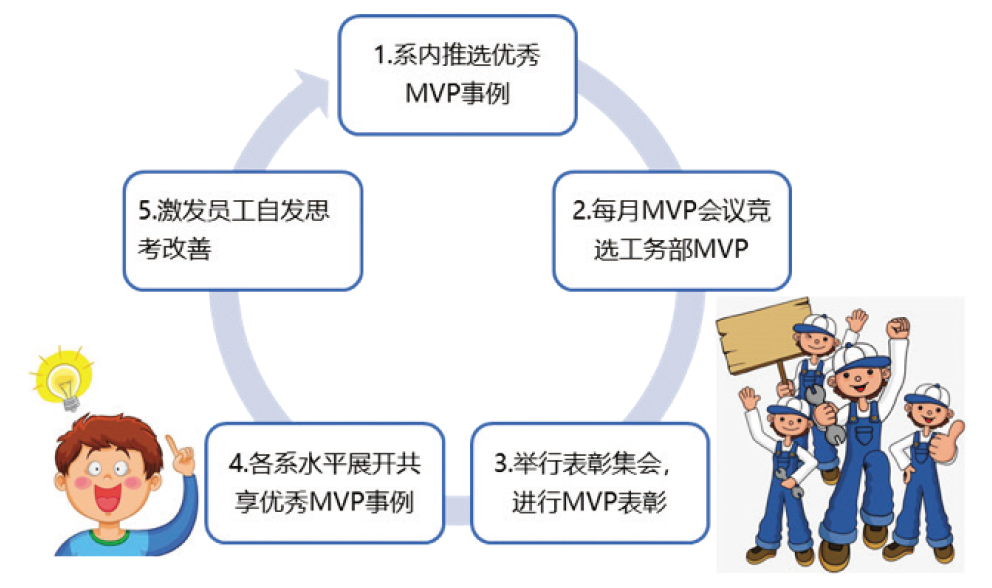 內(nèi)容:構(gòu)建工務(wù)部MVP激勵體制,各系每月推選1名員工競選“工務(wù)部月度MVP員工”,并設(shè)置了“年度MVP員工”名額1名。流程:各系每月推選系內(nèi)MVP員工→優(yōu)秀事例說明、競選→集會表彰→各系水平展開MVP優(yōu)秀事例 |