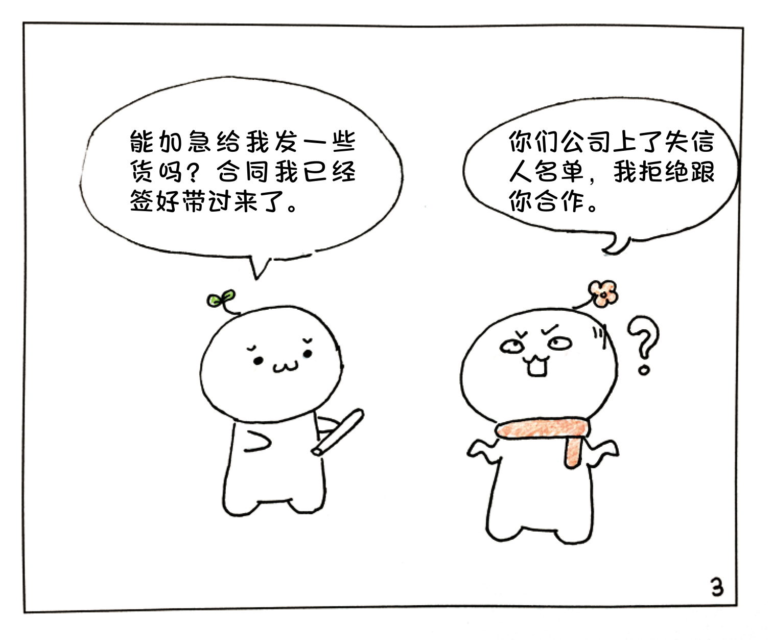 圖中,花朵妹踐行了謹慎選擇合同對象的準則,并沒有因為與樹葉哥多次合作而降低選擇合作對象的標準,有效規(guī)避了可能產(chǎn)生的風險。我們在日常工作中,也應該具備這種風險防范意識,避免為自身招致不必要的麻煩。 |