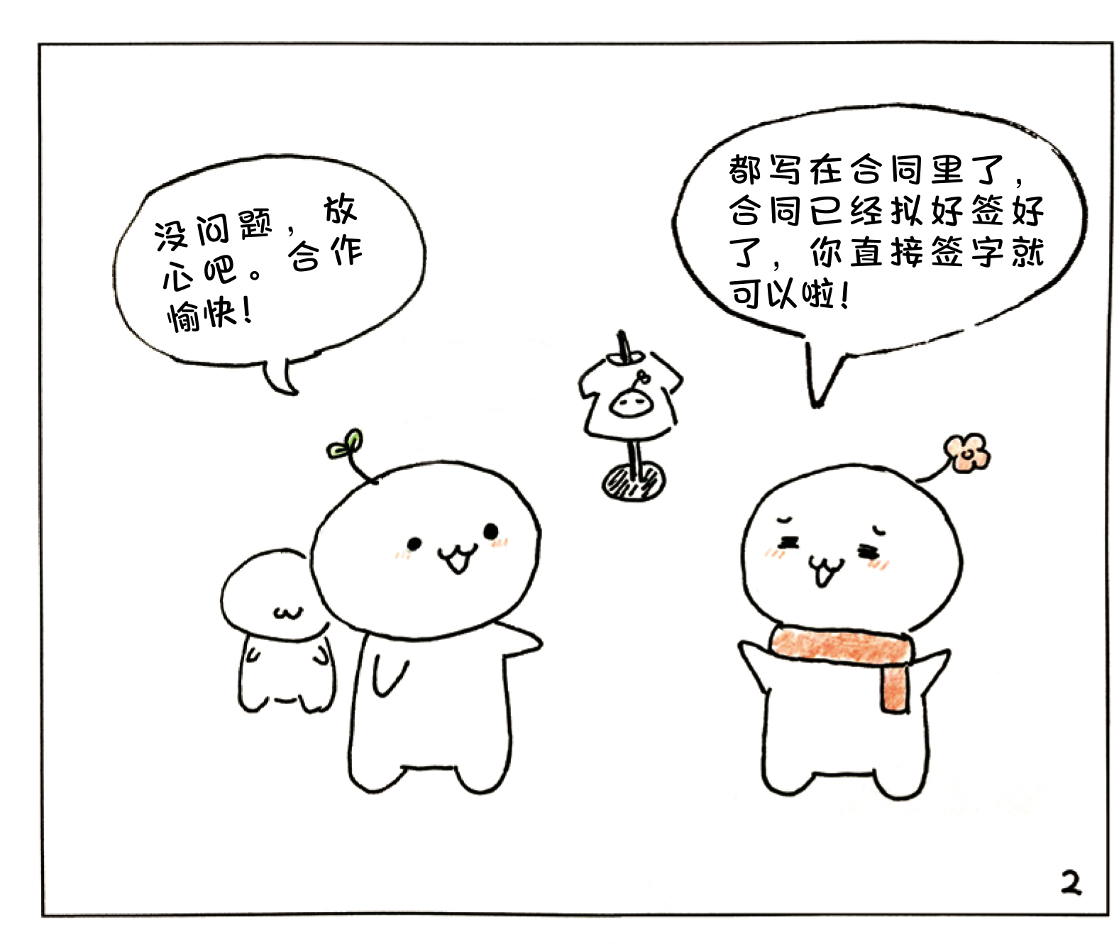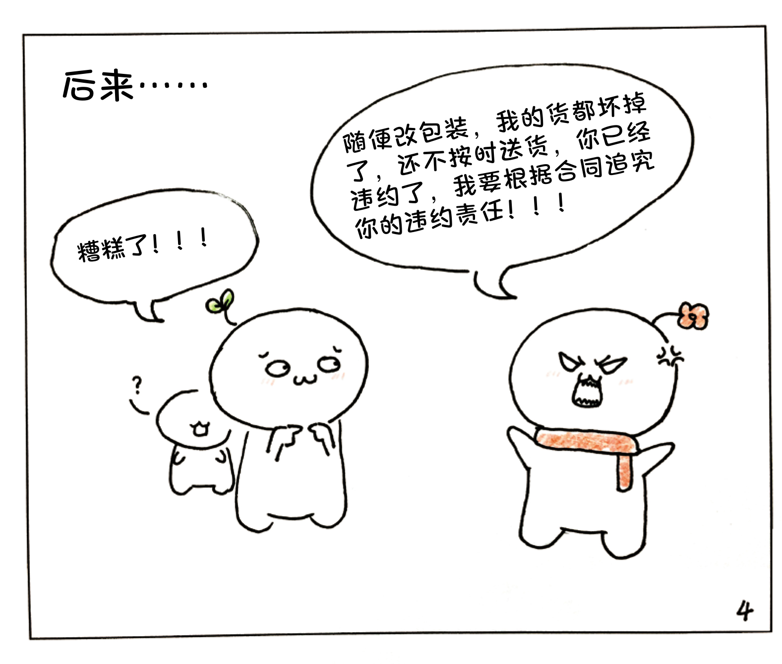 圖中,花朵妹具備風險防范意識,將相關約定在合同中予以明確,故能夠以合同為依據(jù)有效維護自身利益。而樹葉哥擅自更換包裝,且沒有按照合同約定送貨導致承擔違約責任。我們在日常工作中也要注意準確且具體地擬定合同,并嚴格按照合同約定履行。 (以上畫作均來自徐楚芩小姐姐,感謝支持。) |