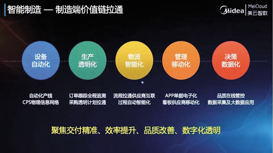 通過設(shè)備自動(dòng)化、生產(chǎn)透明化、物流智能化、管理移動(dòng)化、決策數(shù)據(jù)化,美的集團(tuán)聚焦交付精準(zhǔn)、效率提升、品質(zhì)改善和數(shù)字化透明,并上線美云智數(shù)平臺(tái),為企業(yè)提供全價(jià)值鏈云服務(wù),推動(dòng)企業(yè)數(shù)字化轉(zhuǎn)型。