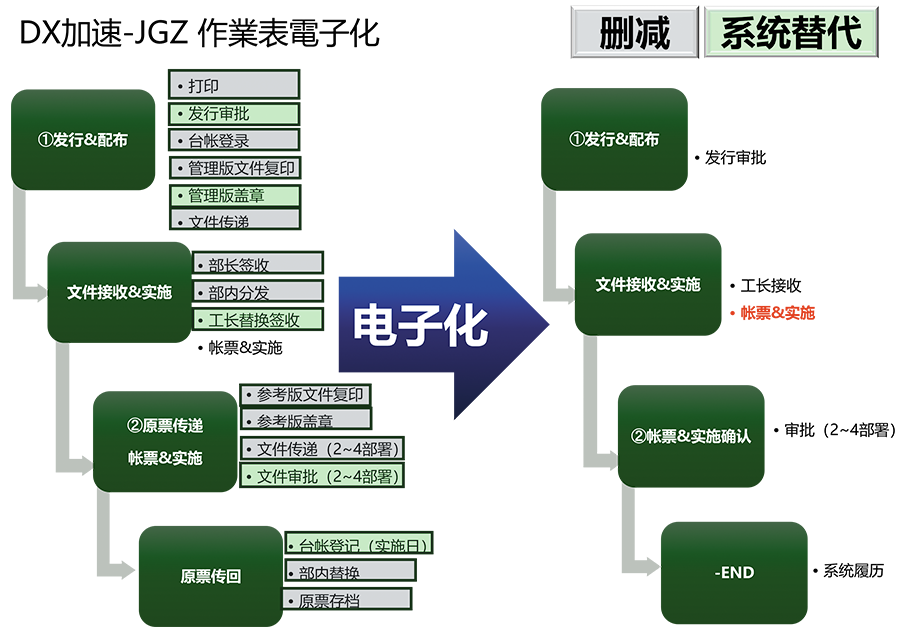 課題對(duì)象是制造關(guān)聯(lián)文件《作業(yè)表》,主要將《作業(yè)表》現(xiàn)行紙質(zhì)文件的“發(fā)行、簽字、文件配布、各部署的接收”,“最新版管理、發(fā)行履歷管理”全部電子化,實(shí)現(xiàn)《作業(yè)表》無(wú)紙化;課題當(dāng)中對(duì)流程、操作、上線等各步驟進(jìn)行了風(fēng)險(xiǎn)預(yù)測(cè),并制訂了規(guī)避風(fēng)險(xiǎn)的方案。