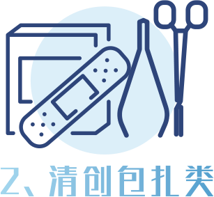 主要用于止血、傷口消毒及處理等作用??梢宰鳛椤凹彝ゼ本认洹?/p> 消毒棉簽/棉花球:蘸取/涂抹藥物、擦拭皮膚 醫(yī)用紗布塊/紗布卷:壓迫止血 創(chuàng)可貼(苯扎氯胺貼):小傷口包扎止血 醫(yī)用彈力繃帶:受傷處包扎固定 三角巾繃帶:普通傷口止血、包扎、骨折固定 止血帶/壓脈帶:止血、包扎 不銹鋼剪刀、不銹鋼鑷子:傷口處理,紗布/繃帶剪裁 醫(yī)用橡膠手套:手部保護(hù) 醫(yī)用紙膠帶:止血、包扎 醫(yī)用酒精/醫(yī)用酒精棉球/片,碘伏消毒液/碘伏棉球/片:傷口消毒,備用少量、小瓶即可 安全別針:固定三角巾